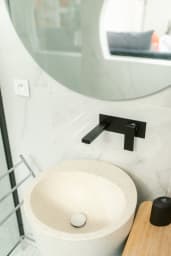 Ein hochmodernes Badezimmer erwartet Sie — eine gelungene Symbiose aus Eleganz und Komfort. Diese edle Räumlichkeit, ausgestattet mit einer ebenerdigen, in den Stein eingelassenen Dusche, lädt zur Entspannung ein. Das puristische Waschbecken sowie ein großer zentraler Spiegel verbinden Stil und Funktionalität. Durchdachte Staumöglichkeiten und ein praktischer Handtuchhalter perfektionieren den Raum. Dezente Holzelemente erinnern an den natürlichen, beruhigenden Geist der Region und garantieren absoluteres Wohlbefinden vom Tagesbeginn an.