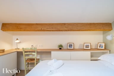 The bedroom offers a high-end Queen size bed in 160x200cm for a restorative sleep. You will also find an iron and ironing board, and USB/USB-C charging points nearby.