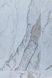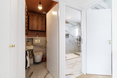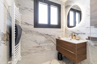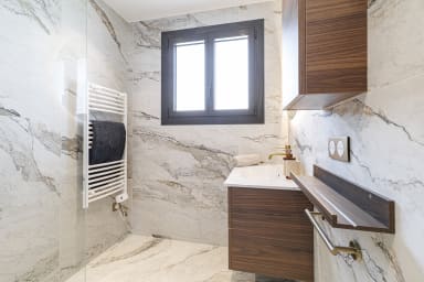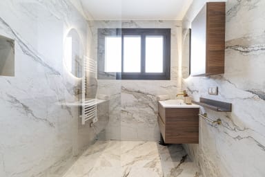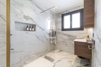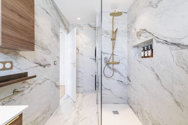 🚿 El cuarto de baño, realizado íntegramente en efecto mármol, combina elegancia y funcionalidad. Incluye una ducha tipo italiana con columna dorada, un nicho integrado con productos a disposición y un toallero calefactado.
