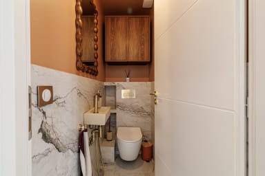 🚽 El aseo independiente está cuidadosamente diseñado: lavabo, grifería dorada, ducha higiénica, mobiliario en madera ébano, paredes en tono terracota y espejo enmarcado crean un espacio práctico y agradable.