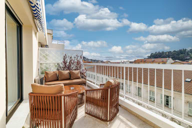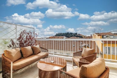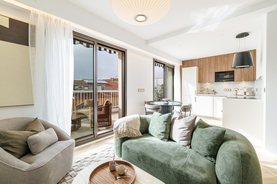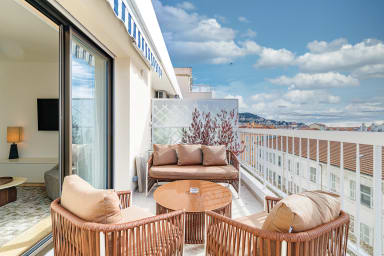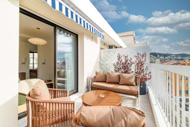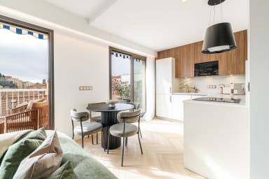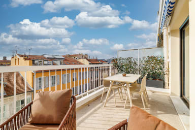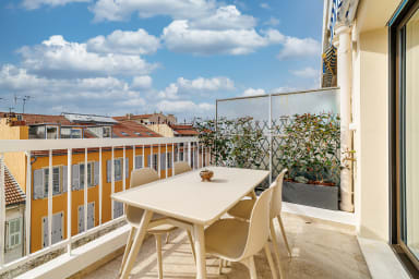 🌿 La terraza de 14 m², accesible desde el salón, es uno de los grandes atractivos del apartamento. Amueblada con una mesa para cuatro personas y un conjunto de exterior, ofrece vistas despejadas a los tejados de Niza, la colina del Castillo y el puerto. La iluminación ambiental permite disfrutarla tanto de día como de noche.