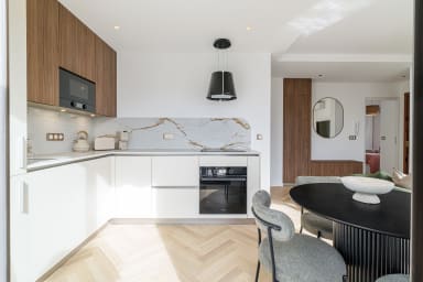 Totalmente equipada, dispone de placas de inducción, horno, campana suspendida, lavavajillas integrado, frigorífico-congelador, cafetera y hervidor de agua.