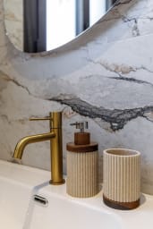 El mueble lavabo con acabados dorados, el espejo retroiluminado y los espacios de almacenamiento optimizan el confort.