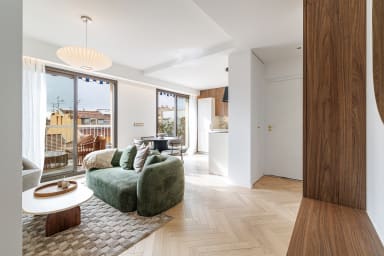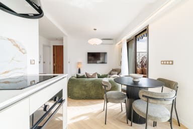La zona de estar disfruta de doble orientación sur/norte, ofreciendo una magnífica luminosidad natural durante todo el día. Se abre directamente a una espectacular terraza de 14 m², auténtica prolongación del salón.